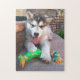 Quebra-cabeça de serra-de-vidro são divertidos em família. Aproveite esta adornada com esta fotografia de um filhote Malamute do Alasca, segurando uma corda colorida e mastigando brinquedos com patas. Clique em personalizar para adicionar texto em um estilo de fonte, tamanho e cor.Fotografia ©Patricia AZ Phillips.