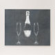 Ilustração de esboço em giz no quadro negro de uma garrafa de champanhe clássica e de flautas.