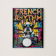 Funny drawing of a French Bulldog playing drums, streetwear style