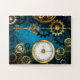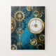 Turquesa, texturizada, fundo steampunk com latão e engrenagens douradas, chave prateada e relógio. Estilo Steampunk.