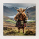 Vestida com um kilt e jaqueta nos Highlands da Escócia, uma vaca das Highlands segura um conjunto de gaitas. Se você quiser esta imagem em preto e branco, vá para Personalizar, encontre os Filtros no lado direito no Designer e clique no filtro Preto e Branco, Feliz criação.