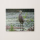 Um suporte da garça-real de grande azul em uma rocha em uma lagoa no verão