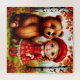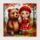 Uma ilustração encantadora de conto de fadas retrata uma garota sorridente e um urso sentado em meio a pássaros e folhas de outono, evocando calor, amizade e encanto mágico.