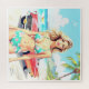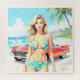 Retrato de uma garota encantadora em uma bela praia tropical com sol e mar, e um carro vermelho clássico, que enquadra o panorama brilhante com cores vibrantes e brilhantes do verão.