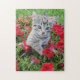 Kitten cinza sentado nas flores anuais vermelhas. Kitten é tão doce e bonito. Primavera