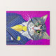 Quebra-cabeça num gato cavalheiro digno, com olhos verdes, num terno listrado azul, com gravata amarela e flor de lapela