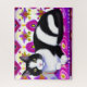 Quebra-cabeça em ilustração de um tuxedo preto e branco sobre uma almofada, com fundo exótico, padronizado em tons de magenta e roxo