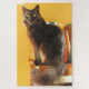 Gato negro sentado na mesa com manchas de fio. Cabelo longo, olhos ouro-verdes. A luz destaca a pele do gato e as manchas de fios.