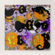 Gatos pretos bonitos entre abóboras, doces de halloween, morcegos, vassoura, estrelas, milho doce, bolota, lua de cheio, folhas de outono e um fantasma cortado todos colocados num pano de fundo roxo leve