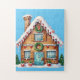 Casa de pão-de-gengibre com um telhado de glacé, grutas de doces de menta com fundo azul-céu.