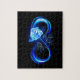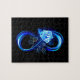 Luminous infinity symbol with glowing, beautiful, lushly blooming rose made of blue flames on black background.