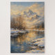 Experience a moment of calm and focus with this elegant oil painting puzzle featuring a serene winter river flowing through a snowy landscape. Bare trees line the riverbanks while majestic mist-covered mountains rise softly in the distance, illuminated by a warm golden winter light.