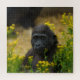 Um lindo gorila bebê sentado num campo de flores amarelas. Seus lindos olhos olhando para você.