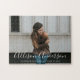 Quebra-cabeça de graduação elegante com o nome da foto do formando e do formando em uma cobertura branca de script de caligrafia. Personalize o quebra-cabeça de graduação de fotos, adicionando o nome da escola e o ano de graduação.