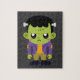 Um quebra-cabeça com uma imagem divertida do Dia das Bruxas com um monstro Frankenstein verde.
