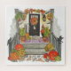 Um gato cinza bonito bate um cochilo na porta de uma casa de Halloween festivamente decorada.