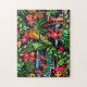 quebra-cabeça de serra de 11" x 14" com uma imagem de meninas havaianas, palmeiras, tikis e flores coloridas a preto. Veja toda a coleção de Quebra-cabeça Hawaii na seção HOME.