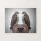 Foto de um falcão em um posto e convertido para parecer com dois falcões se olhando.