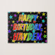 Esta design de quebra-cabeça de quebra-cabeça divertida e vivaz, com tema de aniversário, tem a mensagem "HAPPY BIRTHDAY, HAYDEN" com os personagens que têm um espectro colorido de arco-íris inspirado em um padrão de gradação, além de um campo excitante de estrelas como padrão de fundo. Um quebra-cabeça excitante como este pode ser uma maneira divertida de enviar cartões de aniversários a alguém chamado Hayden. [~Z0000468]