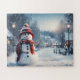 Quebra-cabeça Homem de neve na vila. Cena de inverno.