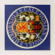 Ilustração vintage de pôster de viagem europeu ou etiqueta de bagagem do Hotel Caledonian, Edimburgo, Escócia, apresentando o brasão de armas real da Escócia. Um desenho circular com um leão vermelho simbolizando o Rei dos Escoceses, no topo do escudo está o elmo e o timbre. O leão usa a Coroa da Escócia e segura o Cetro e a Espada de Estado e os suportes são dois unicórnios coroados e acorrentados. Ao redor do escudo está o colar da Antiga e Nobilíssima Ordem do Cardo. Em Defens, Hotéis da British Transport.