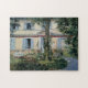 House at Rueil by Edouard Manet, oil on canvas 1882, is a landscape painting of a large yellow house with a tall shade tree, grass, gardens and a walkway path filling the foreground. Manet casually constructs the tranquil scene in contrasting vertical and horizontal geometry, filling the picture plane with middle and foreground landscape elements, capturing the warmth of spring sunlight against the deep, cool shades beneath the luxuriant trees. In a broad range of light to dark and warm to cool tones, the artist captures a seeming moment in time much like his fellow Impressionist painters, though he still boldly deploys the deep ivory black tones that other Impressionists avoided in favor of painterly color effects.