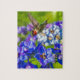 Um brilhante homem rubi atirado fotógrafos de beija-flor num jardim de verão com uma soma de larkspur.