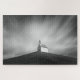 Quebra-cabeça de uma pequena igreja ou capela numa colina sob nuvens desfocadas no céu, em preto e branco, criando uma imagem conceitual muito forte de manter a fé em tempos difíceis.
