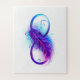 Símbolo infinito com uma bela pena pintada em cores roxas e azuis brilhantes sobre fundo branco.