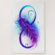 Símbolo infinito com uma bela pena pintada em cores roxas e azuis brilhantes sobre fundo branco.