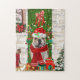 O Natal do Bulldog Inglês sentado do lado de fora da casa decorada com coroa de Natal, a árvore de Natal é uma ideia perfeita de presente de Natal para amantes de cães.