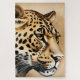 Esta imagem apresenta uma ilustração detalhada da face de um leopardo, capturando seu olhar piercing e seu próprio pelo pintado. A trabalho de arte foca na cabeça do leopardo, com ênfase em seus olhos expressivos, sussurros delicados, e casaco de padrão belo. O fundo é um bege macio com texturas espalhadas, acrescentando uma sensação artística e abstrato que complementa a beleza natural do leopardo. A composição geral transmite um sentido de elegância, força, e o espírito selvagem.