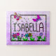 Isabella quebra-cabeça com flores roxas e rosadas, borboletas e bolinhas.