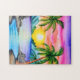 Escape to a glowing shoreline with this Island Tropical Beach Sunset design. Two palm trees frame a calm lagoon and distant mountains as the sun sinks into the water, flooding the sky with rich pink, orange, and golden light that melts into cool turquoise and violet hues. Bold, saturated color and soft gradients give the artwork a dreamy vacation-poster feel, capturing the relaxed warmth of an evening on a quiet island coast.