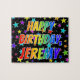 Esta animadora e vibrante design de quebra-cabeça de quebra-cabeça com tema de aniversário tem a mensagem "HAPPY BIRTHDAY, JEREMY" com os personagens que têm um espectro colorido de arco-íris inspirado em um padrão de gradação, junto com um campo divertido de estrelas como padrão de fundo. Um quebra-cabeça colorido como este pode ser usado para enviar uma mensagem de saudação de aniversário a alguém chamado Jeremy. [~Z0000468]