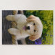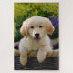 Um jovem e giro Ouro de olhos de cachorrinho num cesto mais vestido entre flores de um jardim. Este jogo de quebra-cabeça de fotos é uma ideia encantadora de presente para doglovers. Um jovem cachorrinho de Goldie fotografado por Katho Menden.