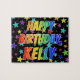 Este vibrante, vivo, design de quebra-cabeça de quebra-cabeça com tema de aniversário exibe a mensagem "HAPPY BIRTHDAY, KELLY" com os personagens que têm um espectro colorido de arco-íris inspirado em um padrão de gradação, além de um campo divertido de estrelas como padrão de fundo. Uma quebra-cabeça colorida como esta pode ser uma maneira divertida de enviar desejos de aniversário a alguém chamado Kelly. [~Z0000468]