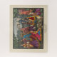 quebra-cabeça de serra de 20" x 16" de Bengala Ocidental, Calcutá 1878-1883. Nesse curioso assunto, Krishna aparece sob a capa de Kali — quatro armados, vestindo terras macabras e projetando a língua vermelha — sendo adorado por seu amante [secreto] Radha, presenciado por outras donas-do-mato (gopis) do clã Yadavas em uma glória de floresta. A verdadeira identidade de Krishna é, no entanto, aludida pelas características do pavão que veste no seu diáema, para não falar da sua pose indescritível. A história conta que o marido de Radha ouve falar de sua aliança com Krishna e se apressa a confrontar seu amante, mas antes que ele chegue (ele está vislumbrado entrando no alto da direita) Krishna se transforma em Kali e instrui Radha a se comportar como se realizasse um puja (culto ritual). O marido enfurecido é enganado por este estratagema e comovido-se a ouvir falar da piedade da sua esposa em adorar a divindade da família. A composição e a configuração têm todas as características de um conjunto de palcos vitorianos, completo com o pano de fundo da paisagem pintada. Veja toda a coleção de Quebra-cabeça de Iluminação nas ATIVIDADES | Seção Quebra-cabeça.