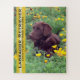 Quebra-cabeça de serra-de-vidro são divertidos em família. Aproveite este quebra-cabeça de 16" x 20", 56 peças de tamanho excessivo, enfeitado com uma fotografia de perto de um Labrador Retriever de chocolate deitado em um patch da California Poppy. Preencha os campos de modelo com suas palavras. Foto ©Patricia AZ Phillips