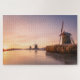 Quebra-cabeça de pintura fotográfica com uma paisagem com uma fileira de três moinhos de vento tradicionais e sementes ao longo de um rio congelado durante um colorido nascer do sol no inverno em Leidschendam, na Holanda.