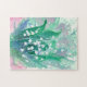 Um bonito quebra-cabeça floral com um buquê de lírio das flores do vale pintado com aquarela em tons de rosa e lavanda macios, com fundo azul e verde reais.