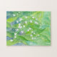 Um bonito quebra-cabeça floral com um buquê de lírio das flores do vale pintado com aquarela em tons pastéis macios de verde e azul.
