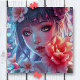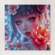 Anime quebra-cabeça. Uma bela garota com olhos cor-de-rosa, flores e notas musicais, arte central, sotaques florais roxos e cor de rosa.