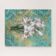 Belo quebra-cabeça apresenta um buquê de lírios brancos antigos em um fundo de ephemera aquática e dourada desgastada.