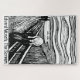 O quebra-cabeça O Grito. Versão em preto e branco da famosa pintura de Munch com o nome desta obra-prima artística junto com o nome do artista impresso na parte inferior. Este quebra-cabeça grande tem 20x30 polegadas e é feito de mais de 1000 peças.