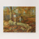 Este design apresenta uma obra de arte original do pintor impressionista americano Childe Hassam (1859-1935). Mostra dois homens cortando madeira de uma árvore derrubada em uma bela paisagem do outono. Há árvores altas em uma fila elegante atrás delas, e há folhas no chão em vários tons de marrom e vermelho. A arte original foi pintada em 1903.