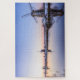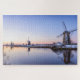Quebra-cabeça de serra de vaivém de uma manhã roxa do inverno durante o nascer do sol com os moinhos de vento históricos de Kinderdyke nos Países Baixos com alguns neve e gelo na água.
