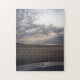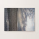 Este quebra-cabeça de serra de vaivém caracteriza uma foto tomada imediatamente depois do nascer do sol na costa arenosa de pouca ilha de Tybee no savana, Geórgia. A parte inferior da imagem mostra o arco do barco usado ao viagem através do pântano de sal da ilha de Tybee a pouca ilha de Tybee. As nuvens macias no céu quebram apenas bastante para mostrar os raios do sol que brilha para baixo no oceano e na praia.