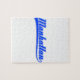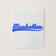 Manhattan, Nova Iorque, escrito com uma haste (cauda). Fontes em branco e azul. Design de texto original.