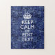 Sua personalização fica tranquila dizendo em um decor de camuflagem digital azul-marinho. Um estilo "Manter Calmo" personalizado dizendo em um presente gentil. Humorístico ou caprichoso experimente suas palavras criativas em duas linhas editáveis de texto. Lembre-se de usar letras CAPITAL para obter melhores resultados.